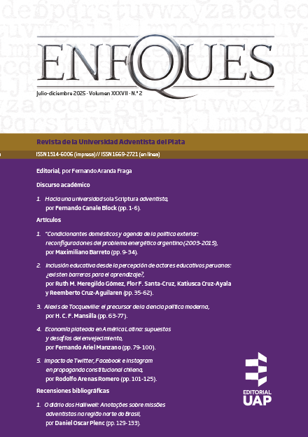 En el primero de los textos, publicamos el discurso alusivo del teólogo adventista Fernando Canale Block, en oportunidad de recibir el doctorado honoris causa otorgado por la Universidad Adventista del Plata en julio pasado, texto centrado en la idea de sola Scriptura como pilar fundamental de la teología adventista. Continúa con el artículo de Maximiliano Barreto, cuyo objetivo es hacer foco en el problema energético como tema de la agenda externa y analizar de qué manera varió y condicionó la política exterior argentina entre los años 2003 y 2015. Luego, un grupo de investigadores docentes de universidades peruanas exponen su investigación acerca de las barreras que imposibilitan que la escuela inclusiva sea una realidad efectiva en la atención de los alumnos en grados inferiores. Para verificar esto, emplearon metodologías cualitativas de investigación. A continuación, Felipe Mansilla propone un texto sobre Alexis de Tocqueville, pensador francés decimonónico y pionero de la